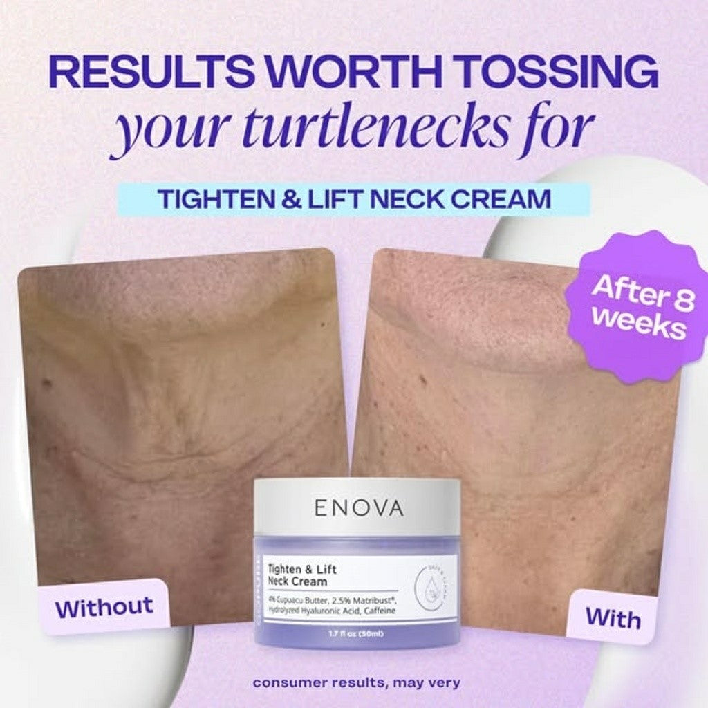 Meet Enova Neck Firming Cream – clinically proven to reduce crepey skin and lift sagging neck & décolletage!